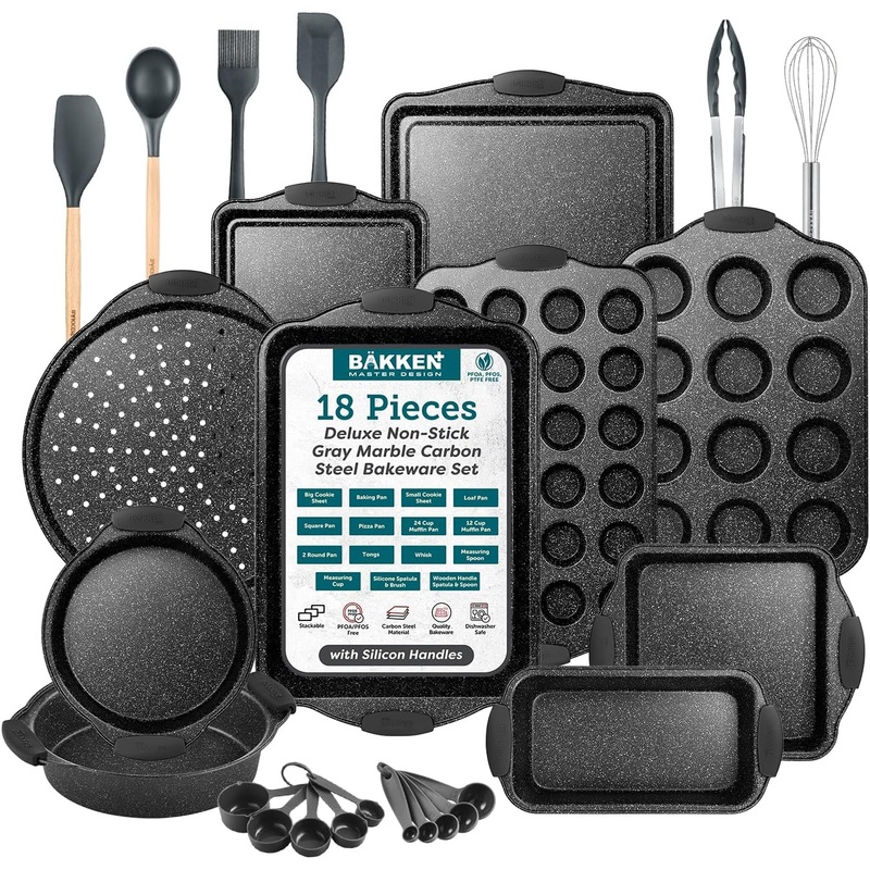 18-Piece Kitchen Oven Baking Set: Nonstick Gray Marble Coating, Carbon Steel Bakeware, Silicone Handles, Dishwasher Safe, Professional Quality, PFOA-Free Introducing the BAKKEN Kitchen Oven Baking Pans a deluxe 18-piece bakeware set designed to elevate you