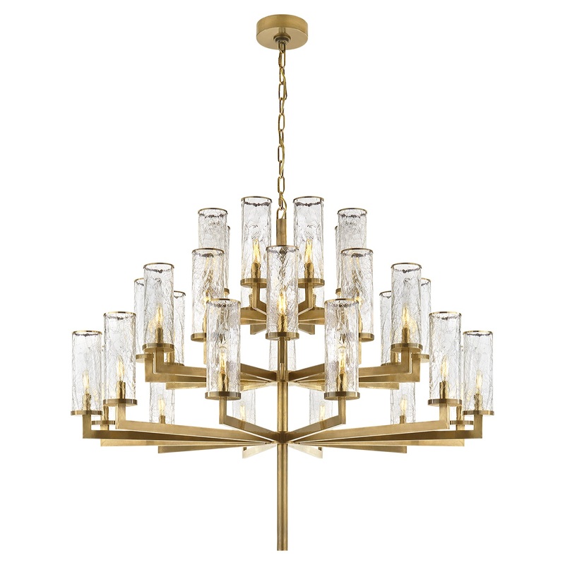 DimensionsWidth: 47.50"Height: 39.50"Weight: 70.00 lbChain: 6'Canopy: 6" RoundLiaison Triple Tier Chandelier in Antique-Burnished Brass with Crackle GlassLight InformationLight Bulbs and/or Light Source are not included.Unsure what bulbs to add to your ord