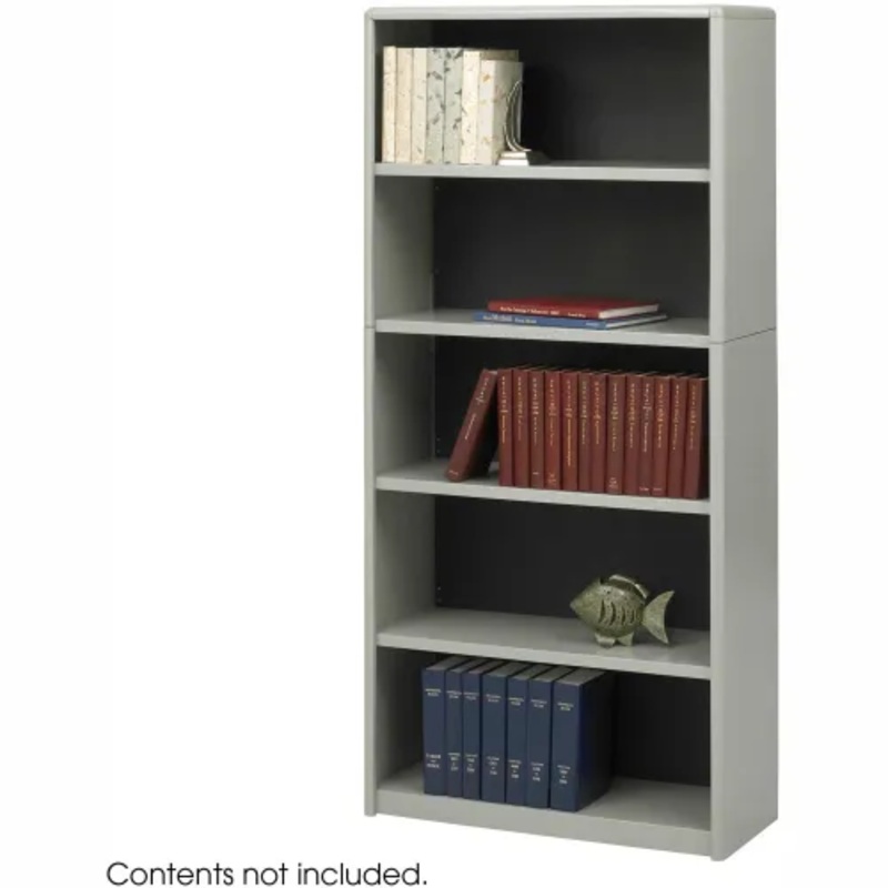 The 5 Shelf ValueMate Economy Bookcase is a Gray workspace organizer with steel-constructed shelves and exterior. With a fiberboard backing, the bookshelf offers 12″ deep bookshelves that can adjust in 1″ increments during assembly. Plastic, snap-in radius corners provide speedy assembly. Fixed bottom and top shelves.