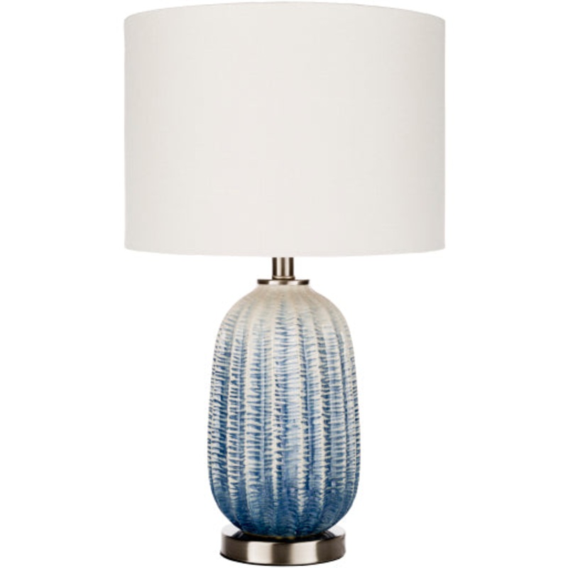Overall Dimensions: 24"H x 14"W x 14"DWhite, Blue Glazed Ceramic BodyWhite Linen ShadeBrushed Metal BaseWood FinialCord Length: 6'Switch Type: 3-WayNumber of bulbs: 1E-26/100 WUL CUL Certified