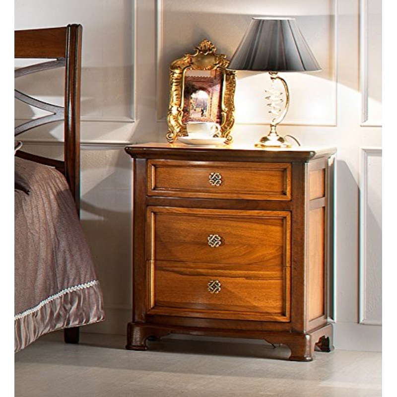 Dettagli: Meraviglioso comodino in noce; due ampi cassetti sotto e un cassetto pi piccolo sopra, tutto in legno massello con incastri a coda di rondine. Disponibile la camera completa di com, letto e armadio. Molto particolare la verniciatura chiaro/scura