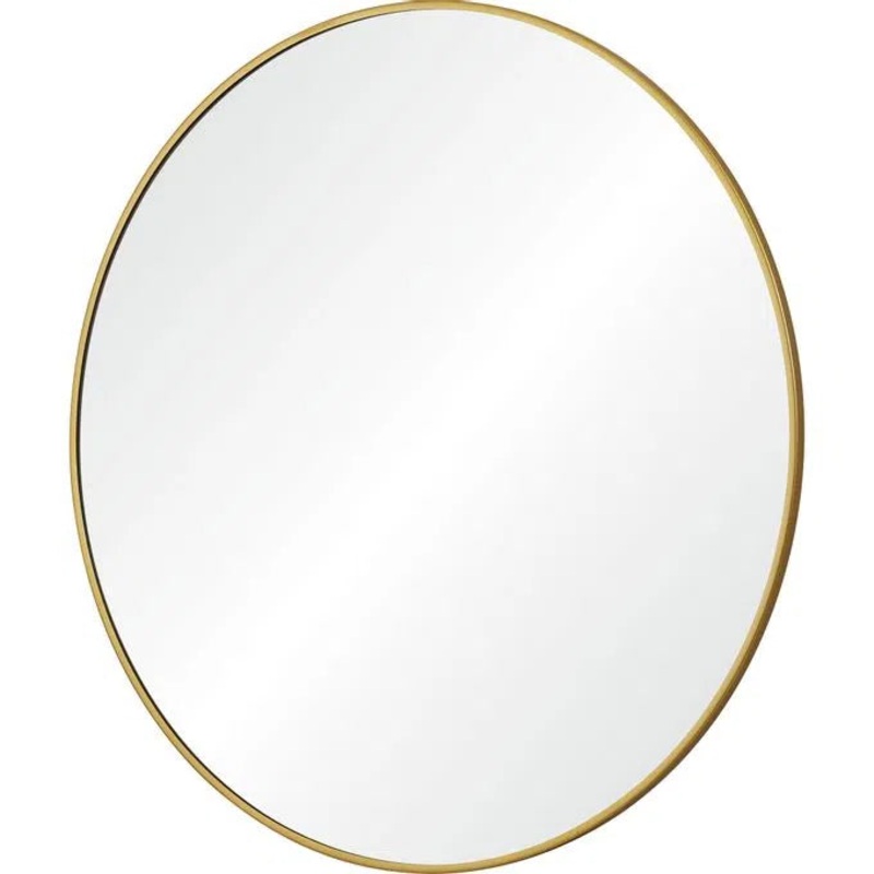 Glamor pours out into the mid-century modern interior space with this mirror. Thanks to a 30-inch circumference, it walks the line between small, versatile design and grand, instrumental piece. With an iron frame showcasing a powder-coated gold finish, its warm details shine without the need for further decoration.