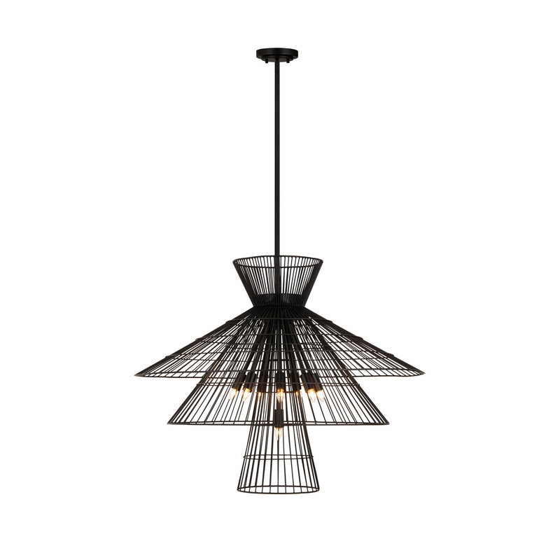 Change up modern dcor with a light fixture that delivers cool personality and a mix of modern and industrial design motifs. This eight-light pendant from the Alito collection creates a stir in any space with a multi-tiered geometric arrangement of charming wired open conical shades. With a matte black finish body, down rod, and canopy, this pendant tells a story in a custom, upbeat dining space, entryway, or main living area.