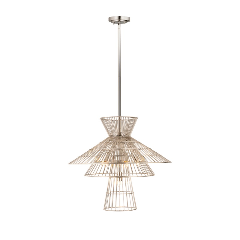 Offer up an energetic look while choosing lighting in a custom space, adding the Alito six-light pendant to steal the show. Gleaming polished nickel finish iron crafts a tiered geometric arrangement of wired pieces and matching down rod and canopy. This striking fixture reflects a blend of industrial and modern styling.