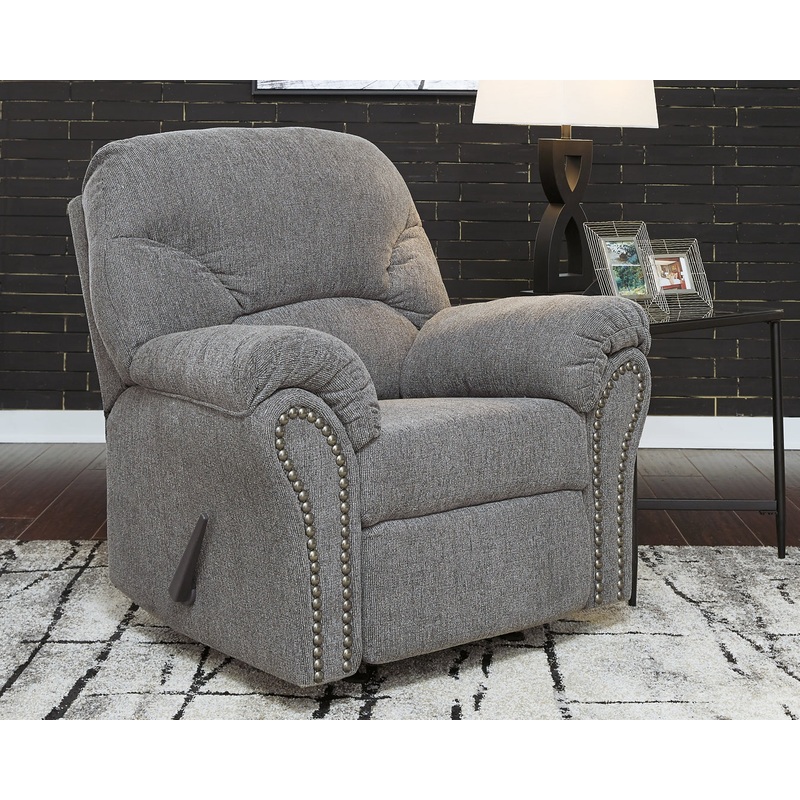 | Details | One-pull reclining motion, Gentle rocking motion, Corner-blocked frame with metal reinforced seat, Attached cushions, High-quality foam cushions wrapped in poly fiber, Polyester upholstery, Black nickel nailhead trim |