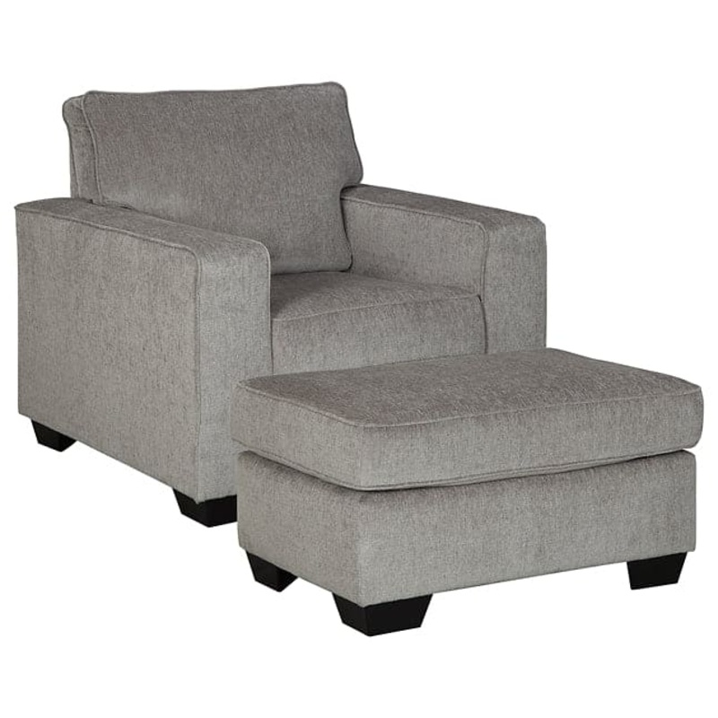 If style is the question, then this chair and ottoman set is the answer. Sporting clean lines and sleek track arms, the decidedly contemporary profile is enhanced with plump cushioning and a chenille-feel upholstery that’s so pleasing to the touch. Sure to play well with so many color schemes, this chair and ottoman set in slate gray is sure to bring fashionably fresh appeal to your space.