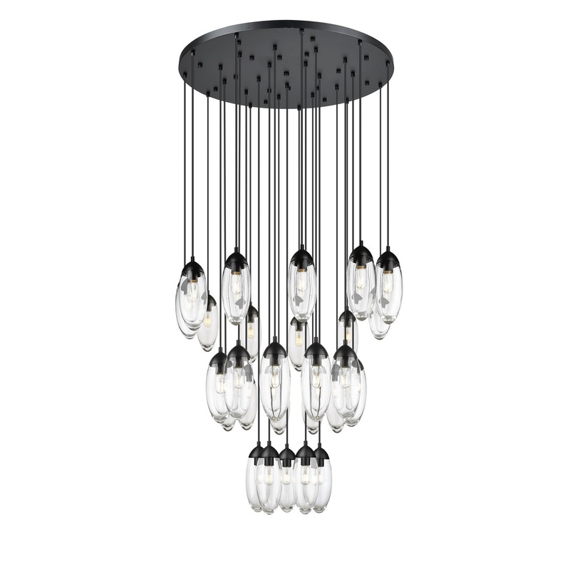 Light reflection plays an enduring role in the design factor of a light fixture with an authentic organic personality. Glam goes a bit easy with this 27-light rounded chandelier representing tempered minimalism as it delivers versatility and artistry. Marvel at the radiance of teardrop glass shades dangling in a circle at graduated lengths from a round matte black finish metal canopy, becoming a focal point in a dining room, living space, or entryway.