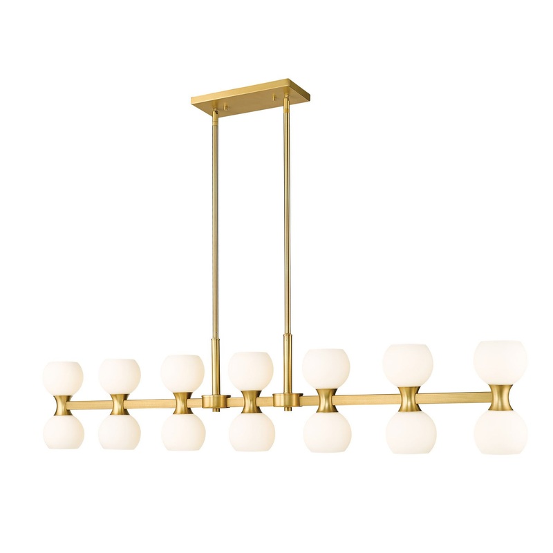 Both Mid-Century Modern and Art Deco elements fashion a statement-making look in this 14-light island light from the Artemis collection. Dress up a transitional kitchen or entertaining space with this island light featuring a sleek linear frame made of modern gold finish steel, with concave elements centering matte opal glass rounded shades positioned to send uplighting and downlighting for an ambient effect.
