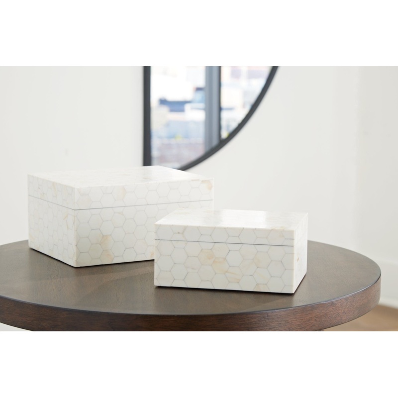 Looking for a casually cool home accent? This set of boxes stacks up beautifully. A hexagonal mosaic design and cream finish bring a laid-back element to your decor. What a stylishly effortless way to refresh your shelves and tabletops.SpecificationsHeight