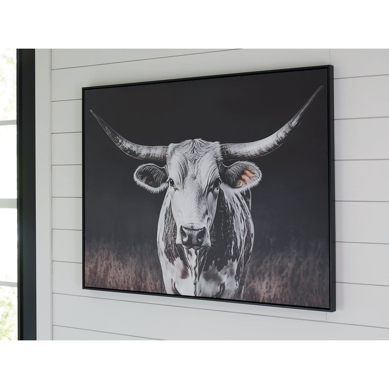 Add homespun charm to modern farmhouse and casual spaces. A longhorn cow takes center stage in this wall art, its white coat contrasting beautifully against the dark background tones. A sleek black frame completes the look.SpecificationsHeight36inWidth47.7
