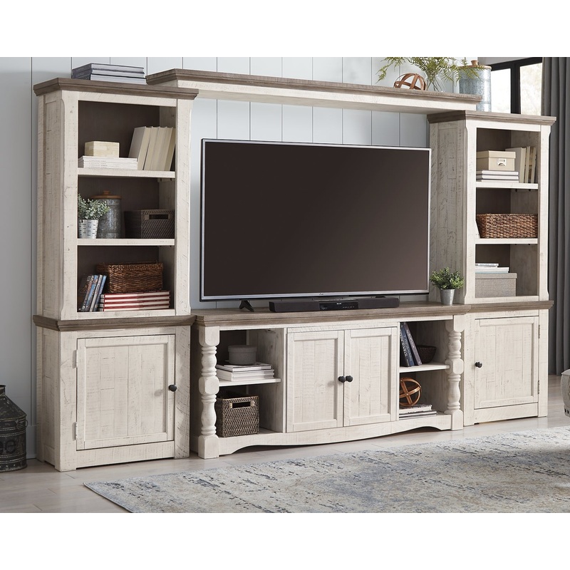 Details Includes TV stand, 2 pier cabinets and bridge, Made of pine wood, pine veneer and engineered wood , Two-tone distressed finish: weathered gray top; vintage white base, TV stand with 2-door cabinet with single-shelf storage and 2 open shelves, Each pier cabinet with 2 fixed shelves and cabinet with single-shelf storage, Aged iron-color hardware, Cutouts for wire management, Assembly required
