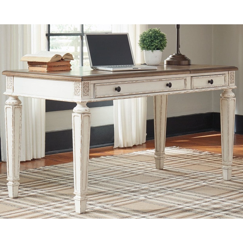 Elevating the art of traditional cottage styling, this desk is your heavenly home office realized. Its antiqued two-tone aesthetic blends a chipped white with a distressed wood tone top for added charm. Framed drawer fronts, decorative corbels and elegantl