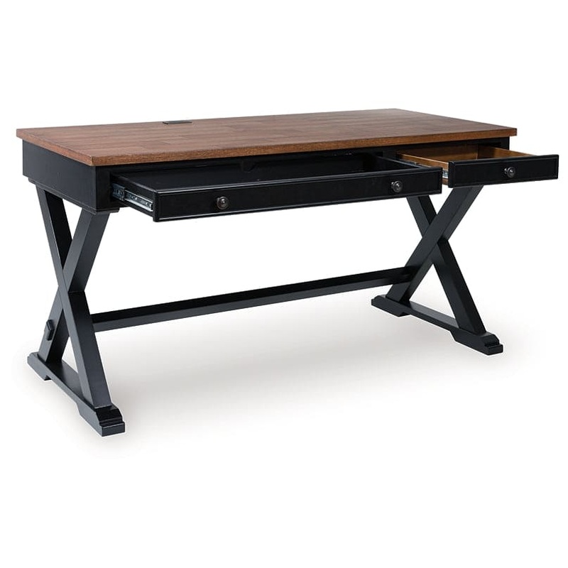 Raise the bar on modern farmhouse style with this home office desk. Its casual good looks are accentuated with a two-tone finish, which pairs a warm satin black base with a contrasting butcher block veneer desktop. The drop-down keyboard and cord managemen