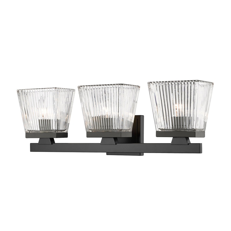 This three-light bathroom vanity light is a stunning example of modern farmhouse design. Crafted from steel construction in a matte black finish, clear glass shades with a ribbed texture illuminate your space cast an ambient glow.