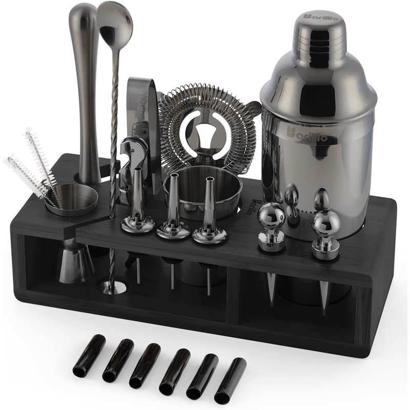 Barillio Black Bartender Kit Stainless-Steel Cocktail Shaker Set w/Black Bamboo Stand Mixology Bar Tools w/Drink Shaker, Mixer and Muddler for Cocktails Home Bar Accessories 23-Pc Bar Set BARTENDING KIT: Designed by bartenders, this 23 piece bar tool set h
