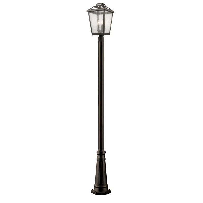 The Bayland family features clear seedy glass set against its oil rubbed bronze colored frame. The multi stepped top crowns this elegant fixture. The fixtures are constructed high quality cast aluminum.