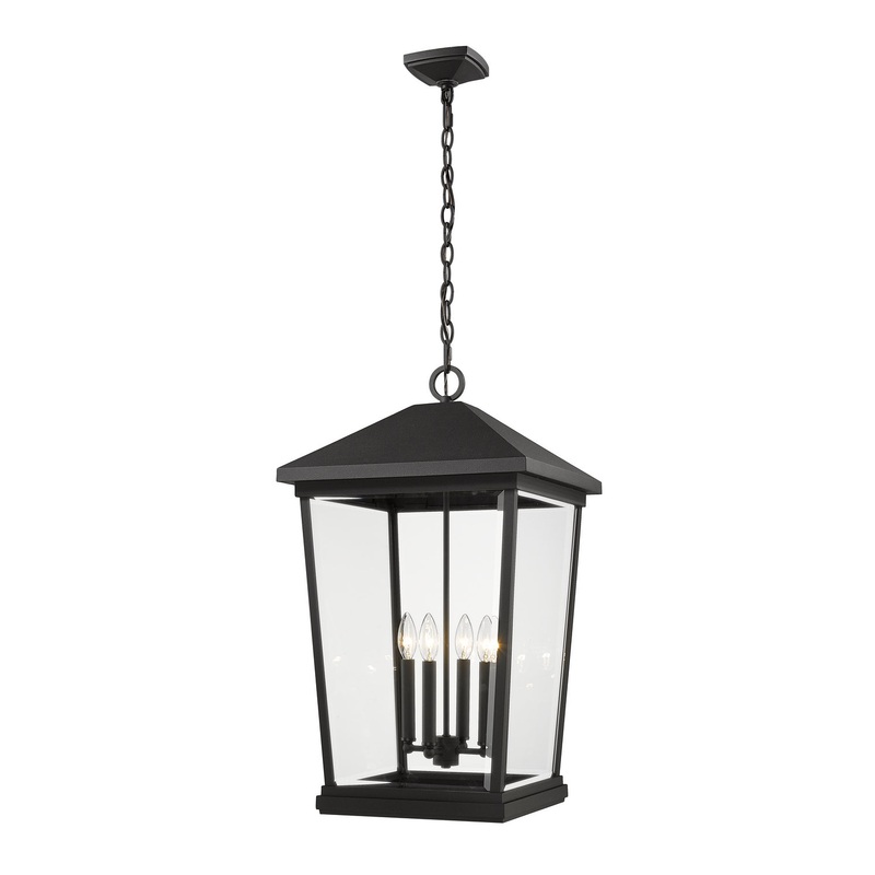 Exterior spaces welcome the charming village-inspired design of this four-light outdoor chain mount ceiling light fixture from the Beacon collection. A tapered rectangular matte black finish aluminum frame invokes a nautical-like housing silhouette with matching candelabra-style bulb mounts and chain, as clear beveled glass panels provide a see-through view. Add soft, romantic style to decks, patios, gazebos, and porches with this ornate light.