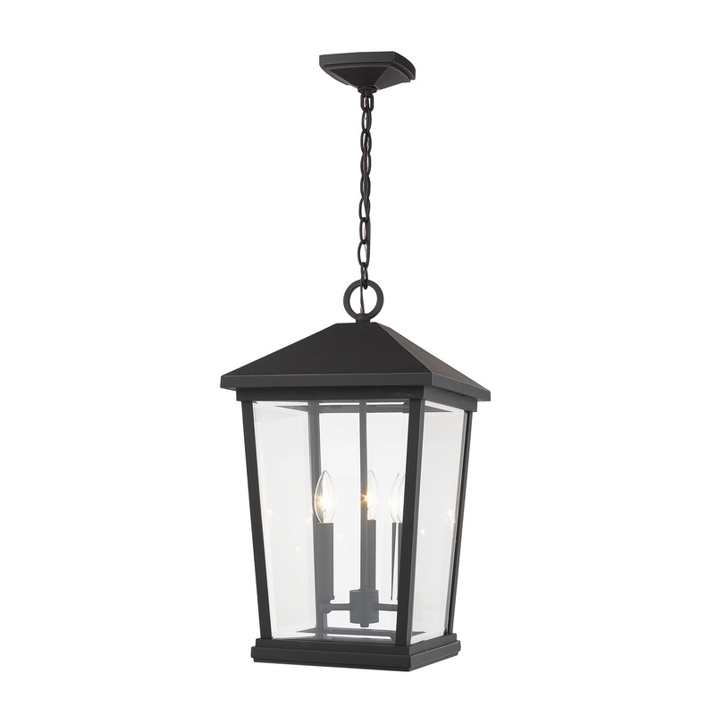 With glass panels and highlighted exposed candelabras (not included), this three-light hanging light is perfect for a charming outdoor space. Put the finishing touch on a porch, or enclosed patio with the twisted edges of the frame in rubbed bronze.Width: