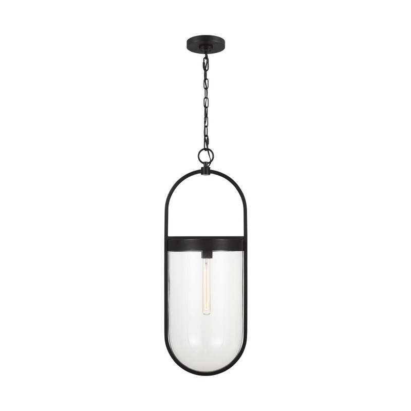 The Blaine one light indoor pendant in aged iron Chapman & Myers is a simple modern interpretation of a classic glass smoke bell lantern. Each pendant is suspended from a unique oval frame which is circumscribed around an inner glass shade. The glass is held in place by a banded metal collar at the top and lit from within with a single filament bulb.