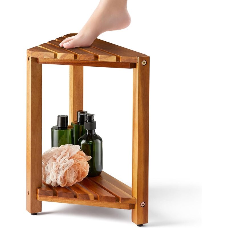 BLUEWEST Corner Shower Stool, Wooden Corner Shower Bench for Shaving Legs Inside Shower, Waterproof Shower Foot Rest with Storage Shelf, Shower Seats and Benches