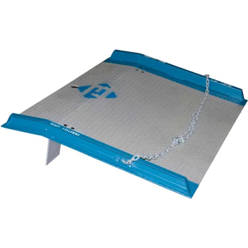 Speed up loading operations, help prevent accidents and reduce labor costs. Anti-skid diamond tread surface and high-visibility beveled curbs for maximum safety. Heavy-duty all-welded steel is ideal for frequent motorized traffic. Maximum impact resistance, strength and safety. Comes with lifting chains. Curb provides full-length handgrip for ease and safety in handling. Safety stop on underside of board fits snugly between truck and dock so board will not move under load. An 11 angle supplied unless another angle of operation is specified. 11″ entry lip with rounded nose protects tires. Meets OSHA requirements 1910.30(A).