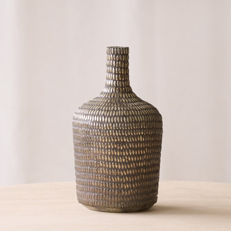 The Bomadi Vase in copper antique glass exudes a blend of elegance and vintage allure. Its warm, rich tones and unique design make it an eye-catching piece, perfect for floral displays or as a decorative accent in any setting.