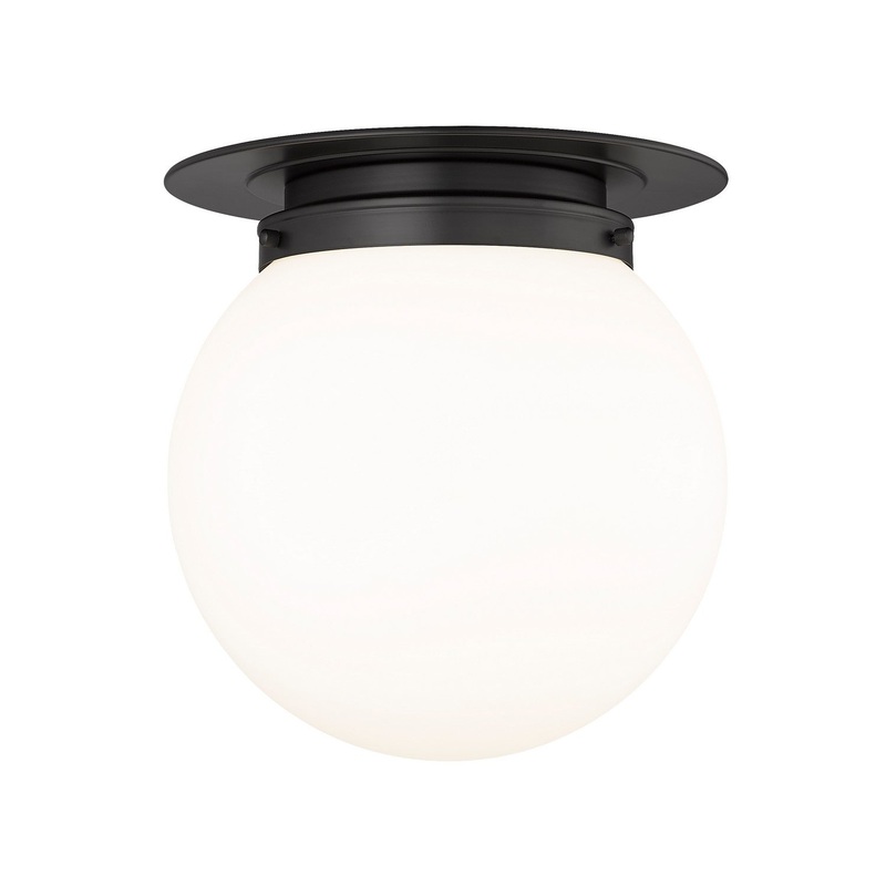 This one-light flush mount from the Calhoun collection shows off bold matte black finish metal framing and accents with a clean silhouette and laid-back attitude. Embrace a charming mix of schoolhouse and Mid-Century Modern design in a fixture with versatility and personality, complete with a white glass globe shade.