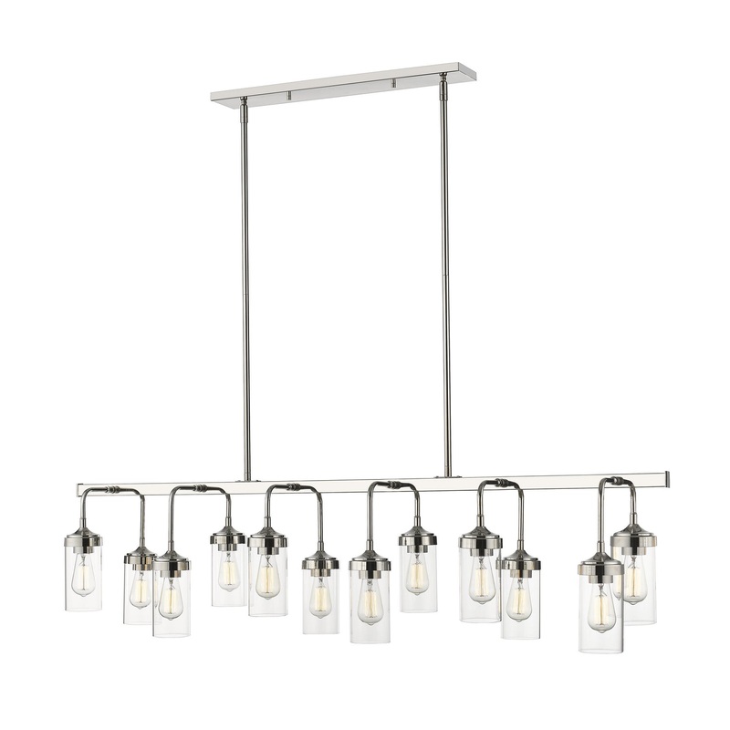 Send a flush of radiant light over a bar or kitchen space with this 12-light island pendant. A carefully designed frame crafted from polished nickel finish steel offers a charming hardware-themed look that showcases cylindrical clear glass shades, adding u