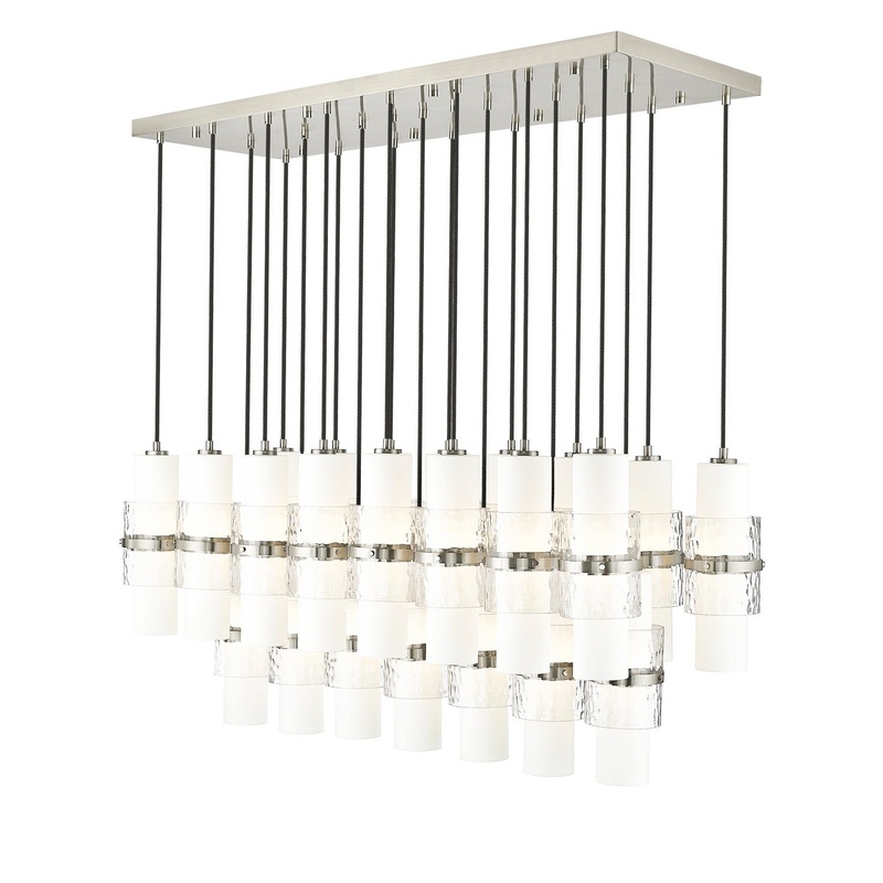 Tiered design and exquisite materials highlight a modern 23-light linear chandelier. Three rows of lights create a spectacular display, each with a layered shade that begins with an etched opal glass cylinder, adds clear textured glass and is secured with a decorative cuff in a rich brushed nickel finish to match its canopy. Braided cloth cord covers complete the look with fresh elegance, perfect for an island pendant in your kitchen or over a dining table.