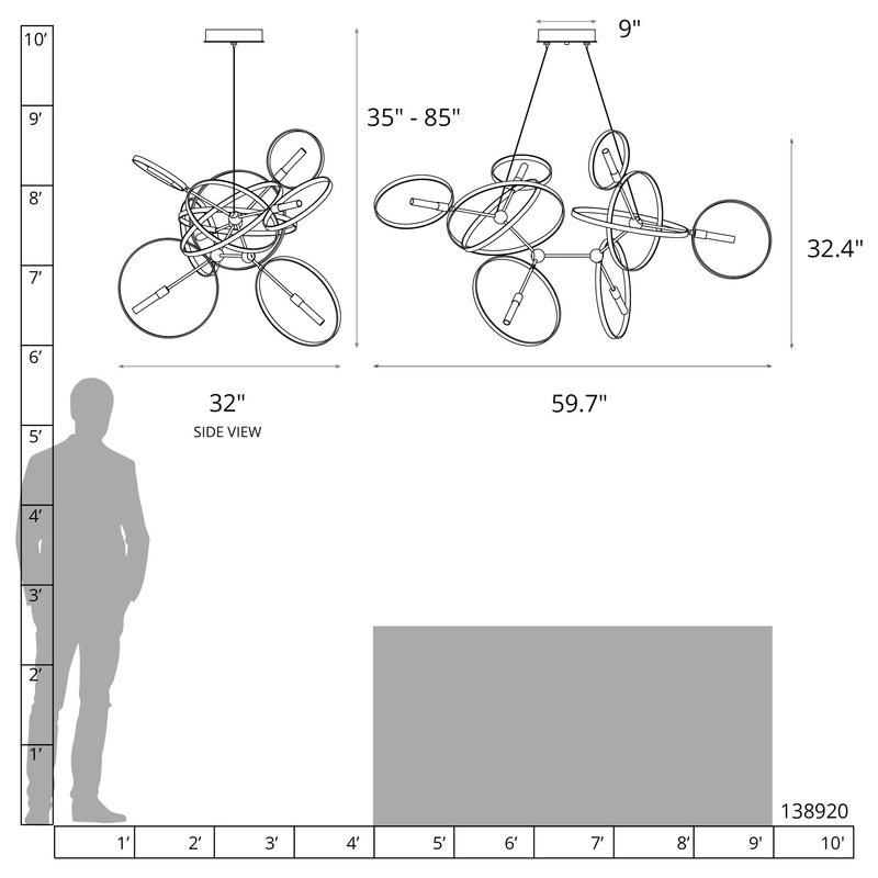 With adjustable rings hung from two steel cables, the Celesse constellation can be personalized. Choice of Soft Gold or Vintage Platinum finish for the aluminum rings and our range of standard steel finishes for the core.