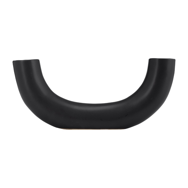 • This ceramic vase comes in a creative half circle design that includes an opening on each end. It comes in a simple classic black color.