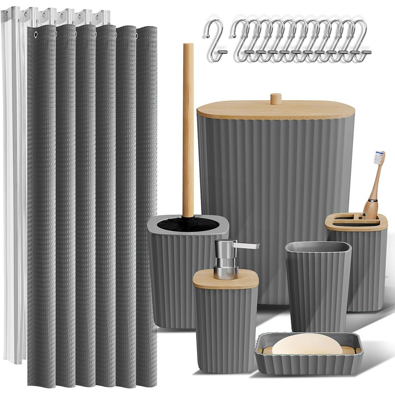 Clara Clark Bathroom Accessories Set Grey Bathroom Set, 20PC Bathroom Accessory Set, Shower Curtain Set, Toilet Brush, Trash Can & Soap Dispenser 100% Polyester Grey Bathroom Accessories Set: Incorporate Grey bathroom decor with our coordinated bathroom ac