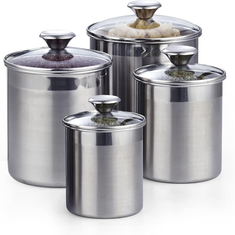 The Cooks Standard one-piece Stainless Steel canister set includes one each of: 0.95 qt/0.9 L, 1.6 qt/1.5 L, 2.5 qt/2.4 L, 3.5 qt/3.4 L, canisters with lids. Canisters are made of premium 18/10 Stainless Steel that is ideal for food storage. Bpa, paint, and phthalate-free. Tempered glass cover is heat and shatter resistant. Wide rim with silicone gasket to seal the canister. Can be used for storing Coffee, tea, sugar, flour, and other dry foods. Not recommended for liquids. Stainless Steel canisters are dishwasher safe, hand wash and dry immediately recommended to keep shine. Lid with seal is not dishwasher safe as silicone gasket may deform with heat.
