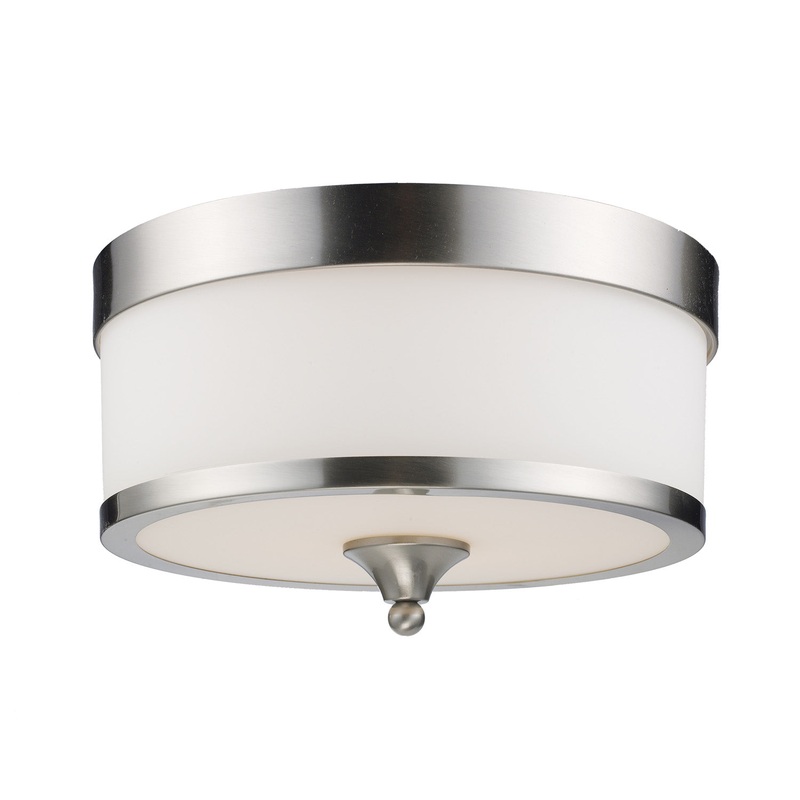 For a cutting edge modern fixture, look no further than this flush mount. A milk white shade is complimented with brushed nickel bands, and accented with a modern styled finial. This flush mount is sure to be great addition to any contemporary space.Width: