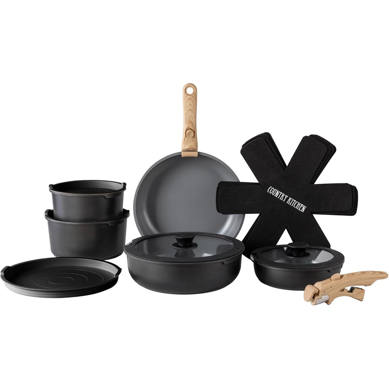 Country Kitchen Cookware Set with Removable Handle, Oven & RV Safe Pots and Pans Set, Cream Gold Speckle Wood Handle, Original, Black/Grey Wood Handle Optimal Storage: With our stackable cookware set with detachable handle, you can finally declutter your k