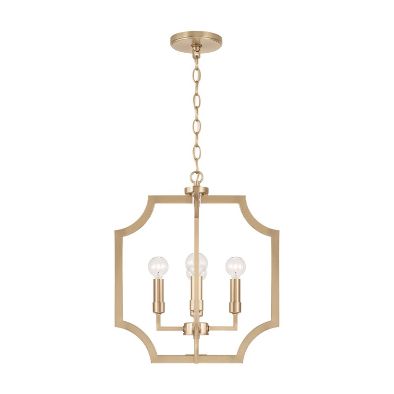 With the open, airy silhouette, the Courtney Lantern Foyer Pendant brings a charming aesthetic that doesn't overpower. The curved corners add chic appeal, while the Matte Brass finish gives a nod to mid-century modern style.Width: 16.00"Height: 18.50"Lengt