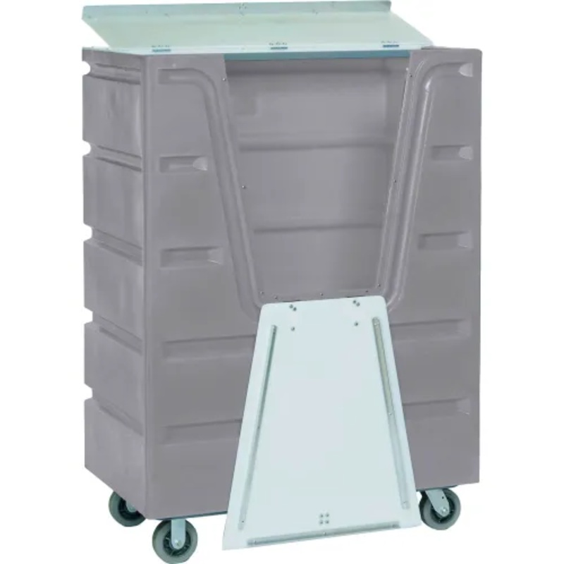 Durable, seamless polyethylene bulk truck has strong, smooth walls. Truck base includes drain holes for easy cleaning. Convenient opening offers easy loading and unloading of goods. Rugged, rust resistant steel dolly base. Rolls easily on 6″ rubber wheel casters (2 swivel, 2 rigid). Includes folding white plastic top and front drop panels with padlock hasp to protect contents.