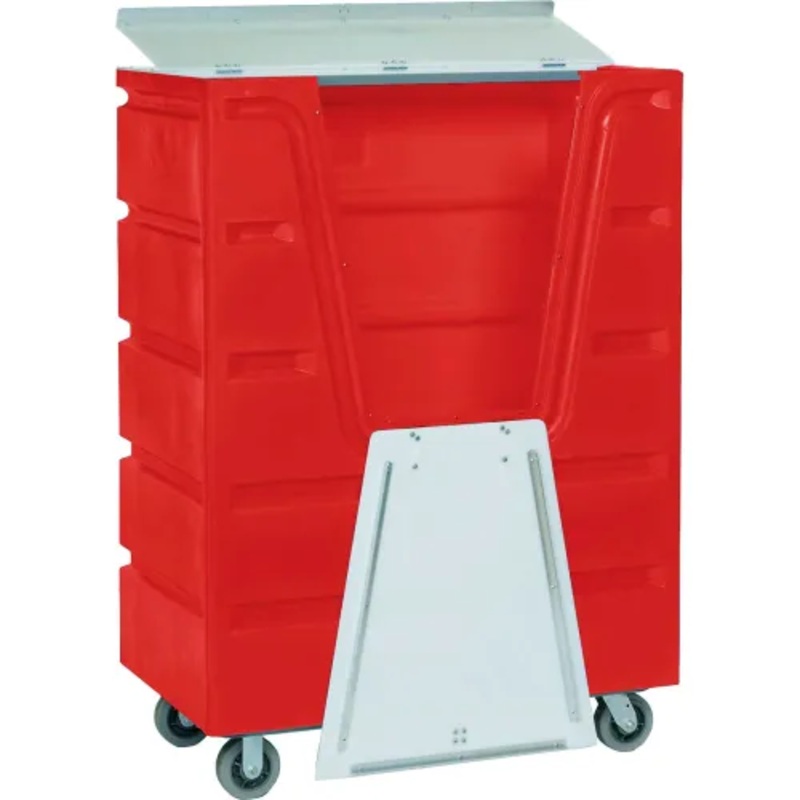 Durable, seamless polyethylene bulk truck has strong, smooth walls. Truck base includes drain holes for easy cleaning. Convenient opening offers easy loading and unloading of goods. Rugged, rust resistant steel dolly base. Rolls easily on 6″ rubber wheel casters (2 swivel, 2 rigid). Includes folding white plastic top and front drop panels with padlock hasp to protect contents.
