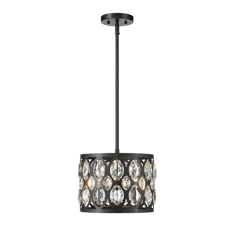 From the Dealey collection comes this elegant and sophisticated three-light chandelier. This chandelier features a matte black steel shade with a striking ellipse punched pattern set with glimmering clear crystal pendants that add a touch of tradition and