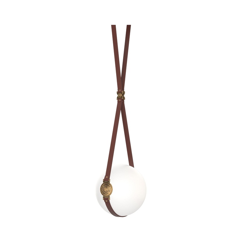 Hung singly over a night table, or in multiples over a kitchen island or bar, the Derby Small Pendant is as intriguing as it is simple. Handcrafted leather straps from a local New England artisan, featuring beautiful brass fasteners and buckles, suspend a single 10″ glass sphere encasing an LED lighting element. The Hubbardton Forge maker’s mark is emblazoned in the Derby’s brass fittings. Also available in Large and Multi-Pendant versions, as well as Semi-Flush and Sconce options. Leather is offered in a choice of British Brown or Chestnut.