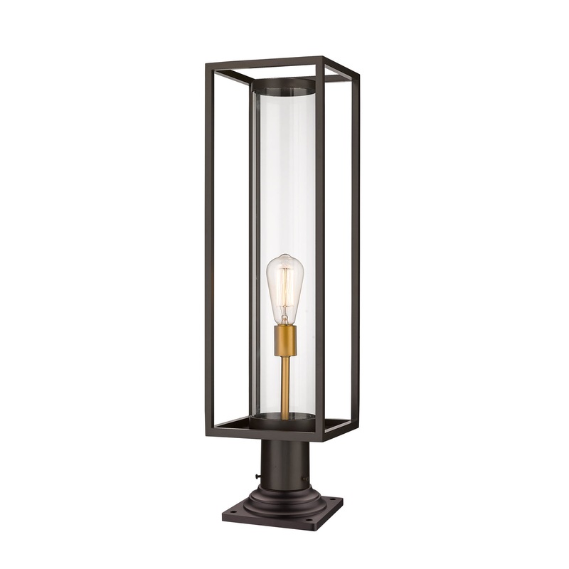Cast a soothing glow across exterior entertainment areas with this modern outdoor pier mounted fixture from the Dunbroch collection. Place this attractive light fixture to walkway columns and corner posts of a deck or veranda space for a striking, contemporary look. Its minimalist, open rectangular aluminum lantern features a classic, deep bronze finish as well as a touch of glamour with a weather-resistant outdoor brass light fixture stand, sheathed by a transparent cylindrical glass globe.