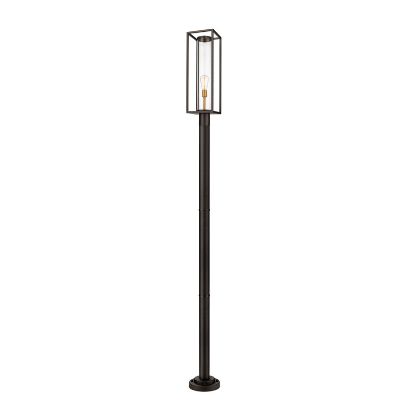 From the Dunbroch collection comes this elegant, contemporary outdoor post mount, ideal for patio decks and railings. With an open and airy rectangular aluminum lantern, this post mount fixture features a single light fixture in a warm outdoor brass finish, and is sheathed inside a transparent tube-like glass globe that allows the light to disperse evenly across pathways and seating areas. This outdoor light fixture also features a timeless deep bronze finish that suits existing building facade materials and colors schemes.
