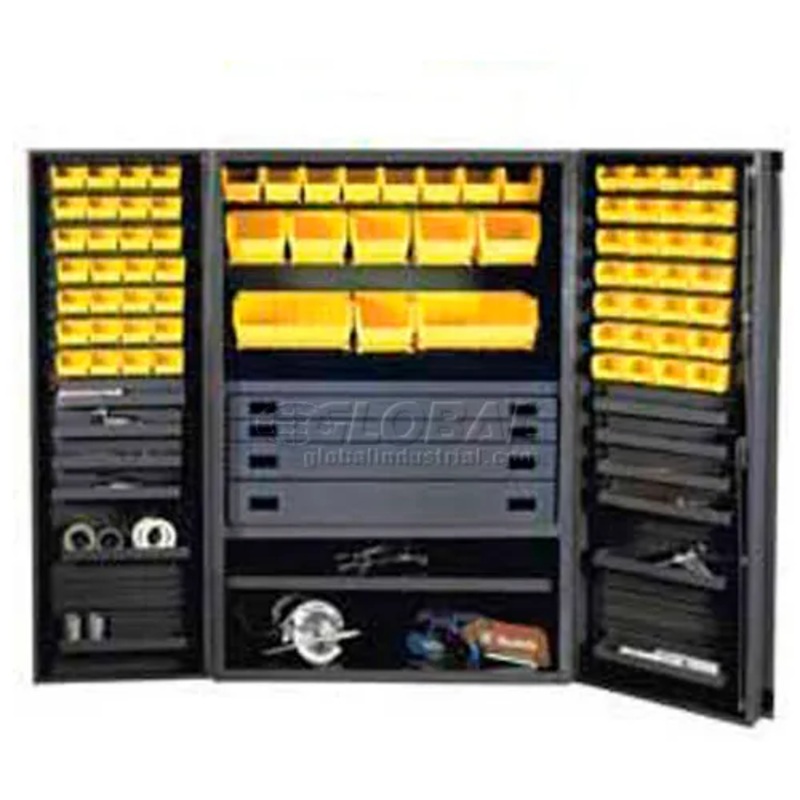 ALL-WELDED 48" WIDE SECURITY CABINET69 Bins with flush doorsConstructed of durable 14-gauge steel cabinet and 13-gauge steel base. Reinforced doors with 3 pointlocking handle and 2 keys. 500 lb.capacity shelves. Gray powder coat finish.All welded cabinets