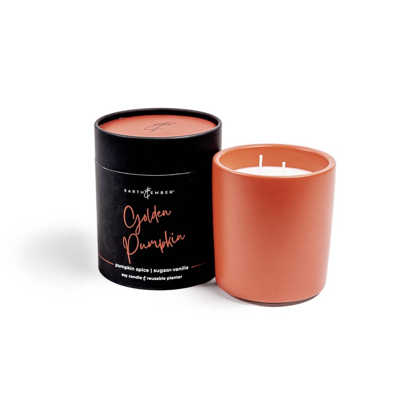 Bright harvest pumpkin gleams with freshly sprinkled cinnamon, clove and melted butter. Toasted ginger swirls into smooth brown sugar, with velvety wisps of vanilla cream.The 13 oz tumbler from Earth & Ember offers a double-wick candle ideal for experiencing your favorite fragrance. This signature size makes the perfect gift and a lovely accent piece for any space. Each candle comes individually packaged, ready for gift giving.Every Earth & Ember tumbler is poured with pure soy wax and accented with premium fragrance oils to provide the cleanest burn. After the wax is gone, reuse the handmade high-quality porcelain vessel as a planter or vase.