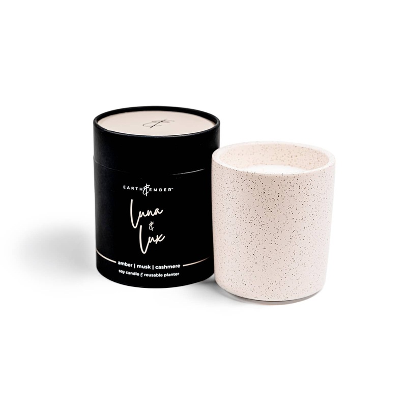 Embark on a timeless journey through the night sky, capturing the essence of the moon and its luminous light, the coolness of white woods sweeping into the warmth of gilded amber and vanilla. Soft musks and silky cashmere drifts in a classic sensual glow, whispering into the surrounding stars.The 13 oz tumbler from Earth & Ember offers a double-wick candle ideal for experiencing your favorite fragrance. This signature size makes the perfect gift and a lovely accent piece for any space. Each candle comes individually packaged, ready for gift giving.Every Earth & Ember tumbler is poured with pure soy wax and accented with premium fragrance oils to provide the cleanest burn. After the wax is gone, reuse the handmade high-quality porcelain vessel as a planter or vase.