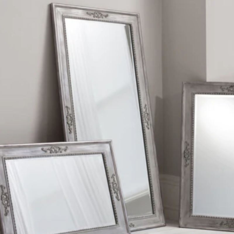 Beautifully traditional looking mirror with a pretty frame decoration in a satin vintage French grey finish