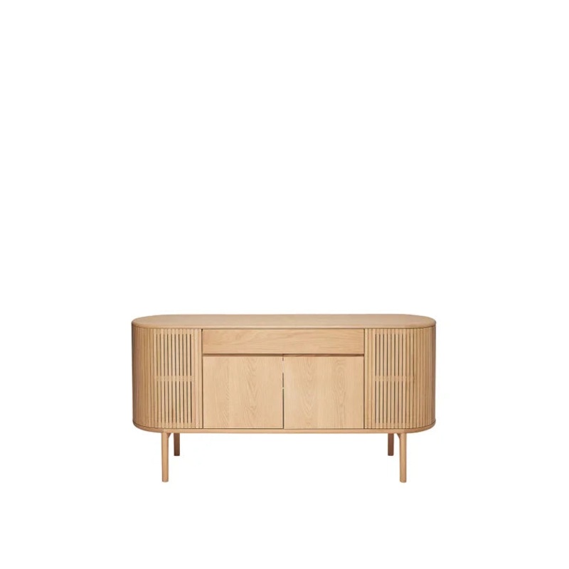 Understated but beautiful detailing make the Siena sideboard a real statement piece. Elegant, curved slatted cupboards frame the cabinet ends with practical push close mechanism and a useful shelf. In the centre a drawer and additional cupboard with an adjustable shelf.