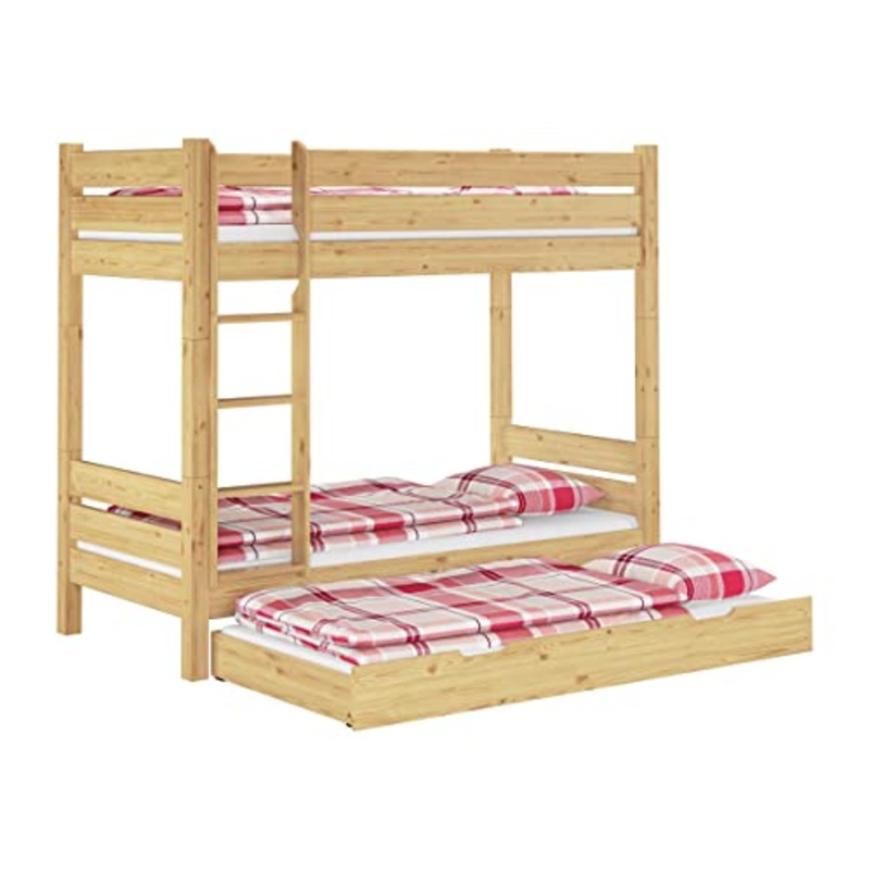 Dettagli: Letto a castello di legno di Pino massello laccato.Di alta qualit adatto per alberghi, appartamenti, ostelli, collegi etc.Con scaletta e bordo anticaduta superiore in assi di legno.Il letto divisibile in due letti singoli.Doghe rigide,materassi e cassettone 3 letto inclusi.(Senza decorazioni)Na… turale !Descrizione:Letto di solido Pino massello nativo di qualit, pregevole fattura,molto stabile.Il legno proviene da foreste europee, gestione sostenibile senza impurit.I raccordi metallici facilitano la costruzione e garantiscono solidit.La larga scaletta di circa (48cm) pu essere assemblata sia a destra che a sinistra.La protezione superiore anti caduta alta circa 43 centimetri.Si prega di notare che i montanti del letto sporgono nella superficie del materasso.Per i materiali morbidi come i materassi in schiuma ecc. questo non un problema.Tuttavia, le reti a doghe in una struttura con telaio o i materassi con molle metalliche potrebbero dare problemi.Dimensioni:Superfici d’appoggio/materassi: 90×200 cmDimensioni esterne: circa 210x102x180 cm (Lungo / Largo / Alto)Spessore zampe: circa 6,8×6,8 cmSpessore assi: circa 2,9 cmAltezza nicchia: circa 100 cmProfondir inserimento: circa 8 cmPortata Max: 120/100 kg (Basso/Alto)Descrizione Materassi:Due materassi RG26 in schiuma. 90×200 cmAltezza totale ca. 140mm, altezza schiuma 120mmDurezza media = H2Materasso confortevole fino a peso persona di ca. 90kgFoderato con tessuto traspirante.,Interno 50% cotone, 50% poliestere.Materasso molto accogliente e confortabile, adatto anche per bambini e per tutti i tipi di doghe/assi.Descrizione cassettone letto:Dimensioni esterne: circa 195x90x18 cm (Lung. / Larg./alto )Un materasso per il cassettone di ca. 90x190x14 cm e profondit inserimeto ca.14cmColore legno pino laccato.