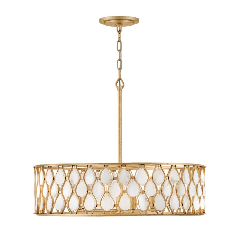 Opulently adorned with natural alabaster stones held within a traditional latticework shade, Estie brings organic elegance to any aesthetic. Intricately curved metalwork complements the frame, chain, and canopy in a textured Piastra Gold finish.