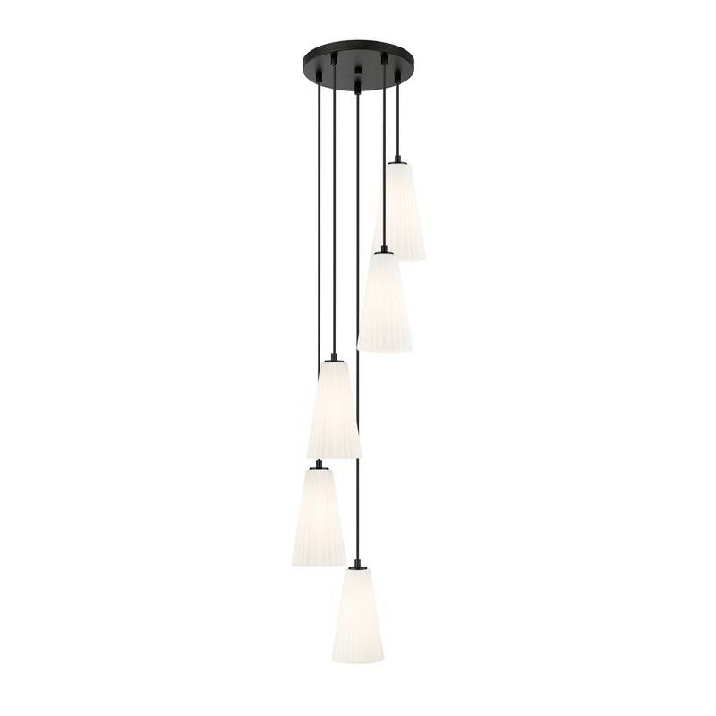 Embrace the spiral design of a modern five-light chandelier. A matte black finish canopy creates depth and contrast, while elongated conical shades in frosted glass encircle the fixture to provide soft, diffused illumination over a staircase or foyer.